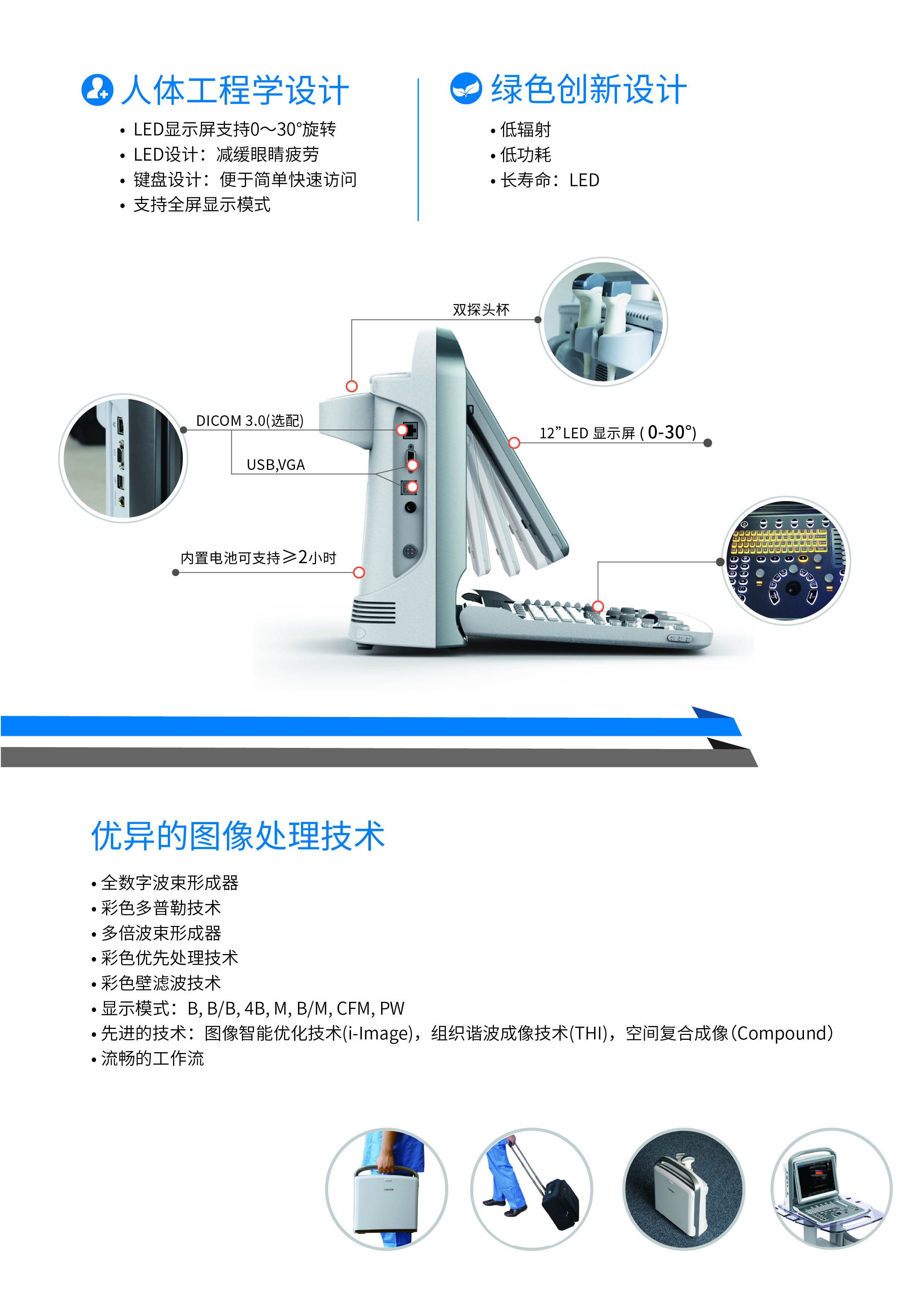 ·集成成像技术,设计成一款轻盈时尚的便携超声,顺畅的工作流、简易化视图,一键升级、完善的软件测量包,可用于床旁诊断和移动救护。